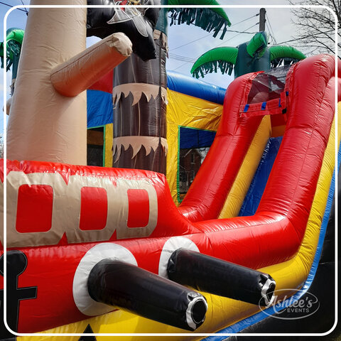 Ahoy there, mateys! Get ready to embark on a swashbuckling adventure with our Pirate Ship Bouncy Castle Combo. This extraordinary inflatable masterpiece combines a large bouncing area, a basketball net, and an exhilarating slide to create an unforgettable experience that will ignite the imaginations of all young adventurers.